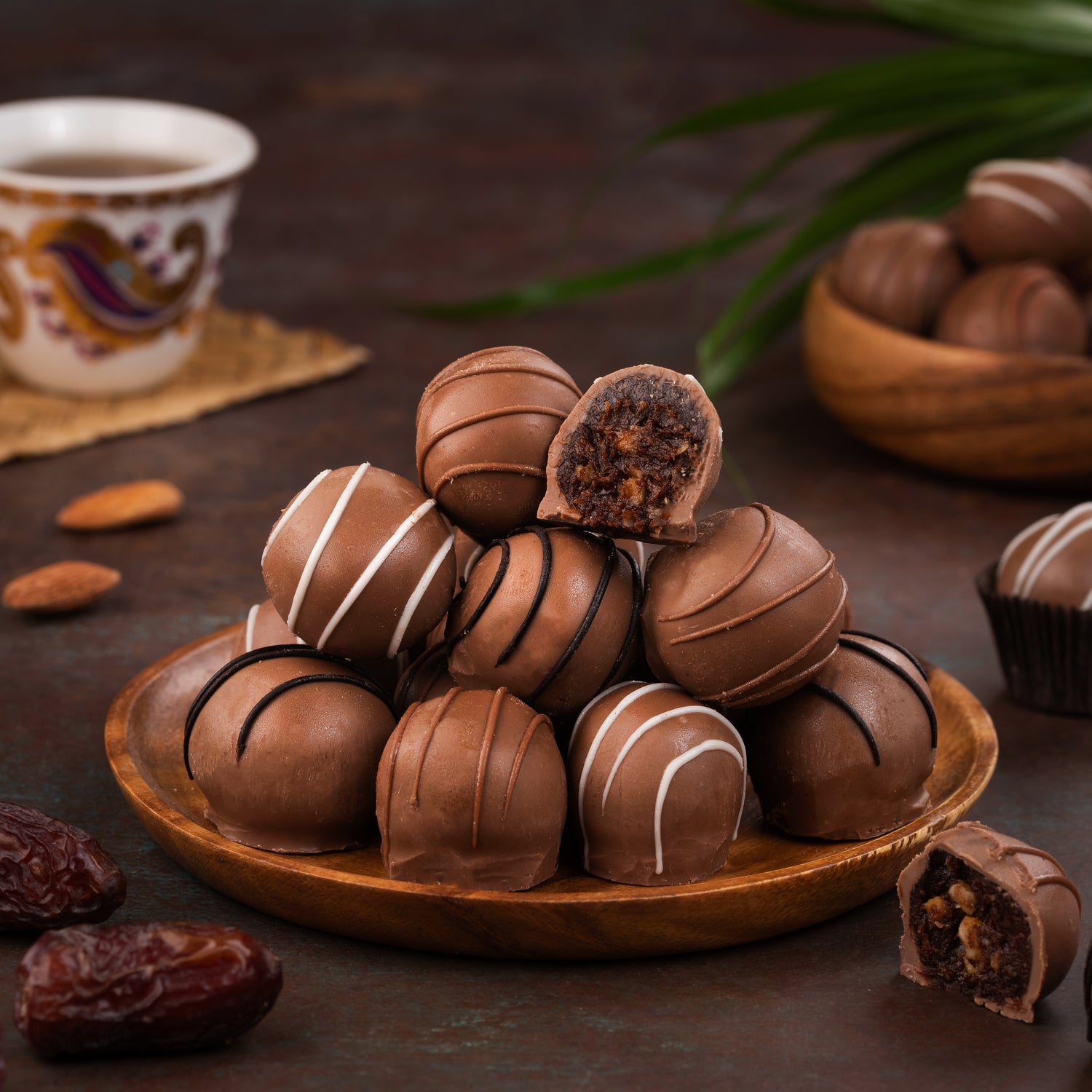 Premium Arabian dates coated in rich milk, dark, and white chocolates.